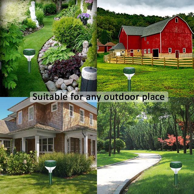 Dispozitiv alimentat cu energie solară, combină lumina solară de grădină împreună cu alungarea cârtițelor și șerpilor. Emite vibrații ale undelor sonore pentru a simula pericolul și respinge dăunătorii. Dispozitivul radiază în toate direcțiile, undele sonore, evitand orice obstrucție. LED-urile albe aleaparatului, vă pot lumina grădina și o vor face mai frumoasă.