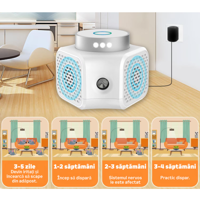 Alarma emite ultrasunete care alungă de pe o anumită suprafață rozatoarele: șoareci, șobolani, dihori, etc. Ultrasunetele emise nu sunt sesizate de urechea umană, în schimb ele sunt perfect sesizate de către rozătoare, iritându-le auzul. Aceasta face ca să părăsească acel spațiu, ocolind raza de acțiune. Eficiența maximă a aparatului se constată după 10-15 zile de funcționare continuă, după care se lasă să funcționeze preventiv. Aparatul nu este dăunător pentru oameni, animale sau păsări. Alarma este superioară altor metode de combatere a rozătoarelor (otrăvuri, capcane, etc.), nu poluează mediul, punerea în funcțiune nu necesită calificare, utilizarea în timp este nelimitată, nu necesită întreținere, consum minim de energie. Se poate utiliza și chiar se recomandă acolo unde nu se pot folosi otrăvuri sau în combinație cu metodele clasice. Alarma se folosește și preventiv pentru a nu pătrunde rozătoarele în anumite spații.