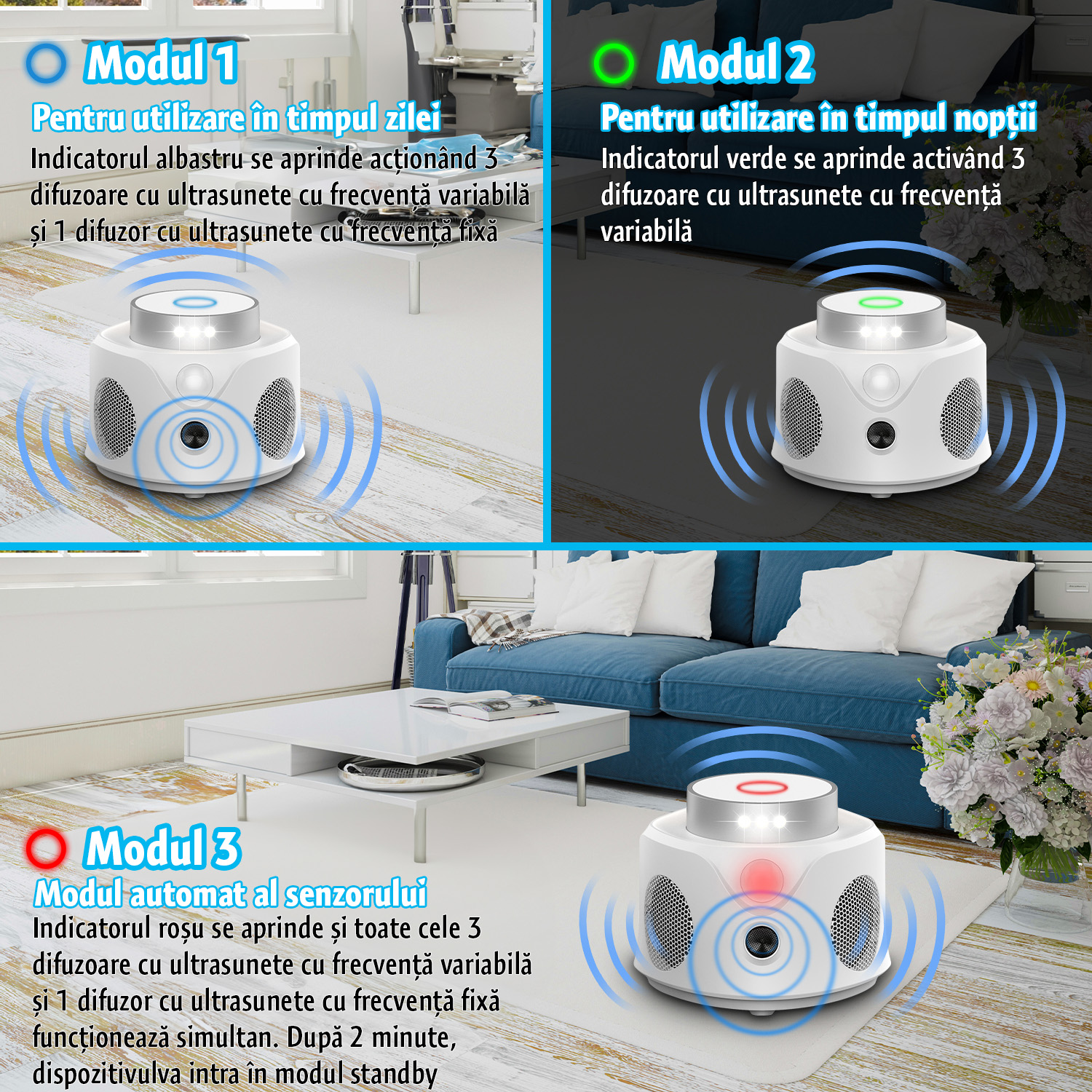 MODUL 1 – (pentru utilizare în timpul zilei): indicatorul albastru se aprinde și apoi se activează cele 3 difuzoare cu ultrasunete, cu frecvență variabilă și 1 difuzor cu ultrasunete cu frecvență fixă.